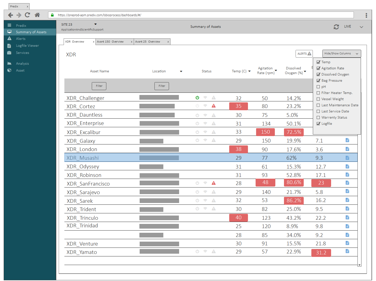 We created a fully customizable dashboard to monitor multiple bioreactors in real time. Since the manufacturing process is still relatively new, scientists are constantly experimenting to further improve the process. This table allows users to quickly hide or show whatever data is most useful for their process as well as quickly alerting them to any potential problems which can be fatal.